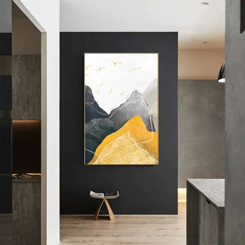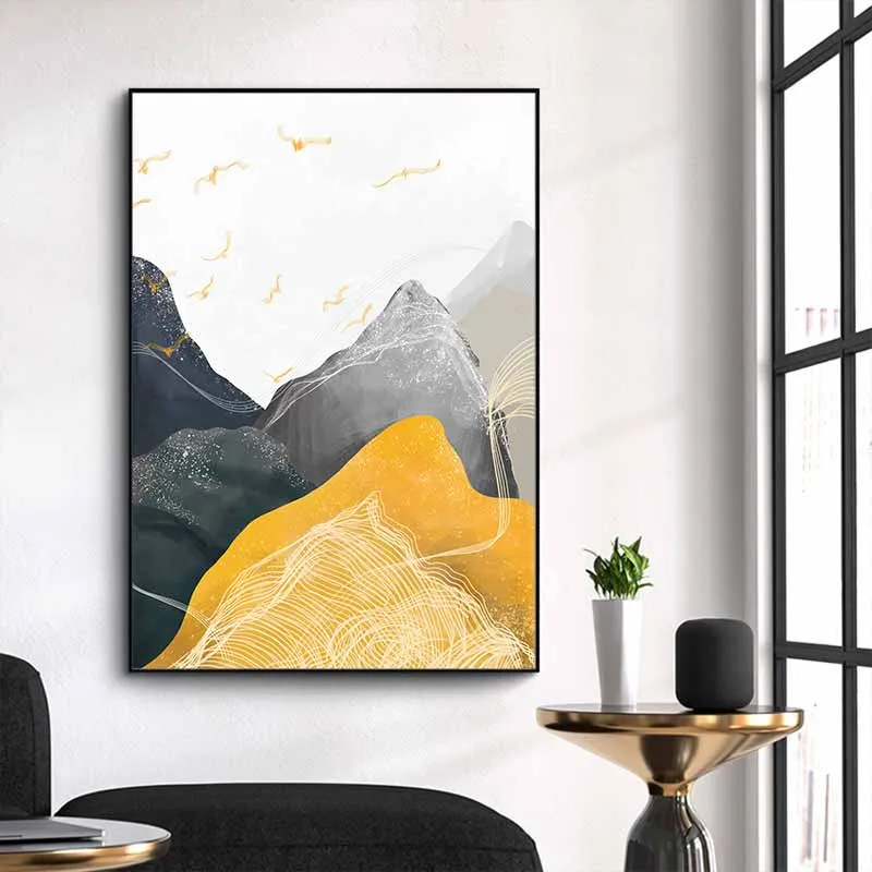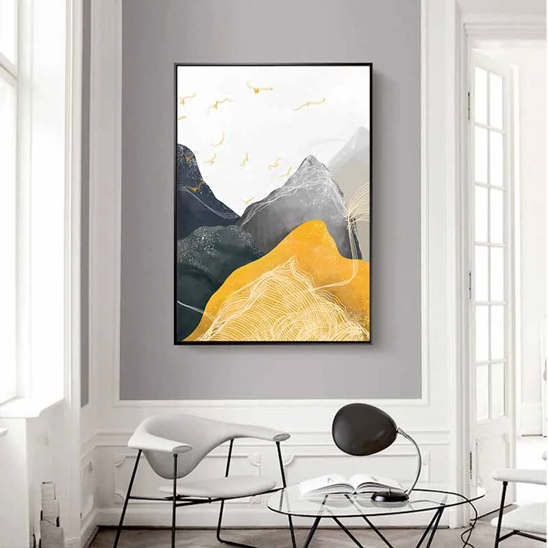Tranh trừu tượng núi đồi và đàn chim đang bay