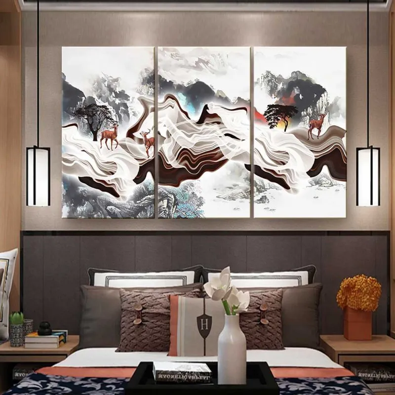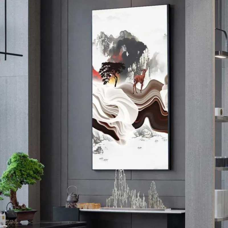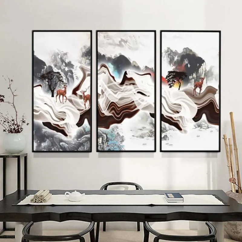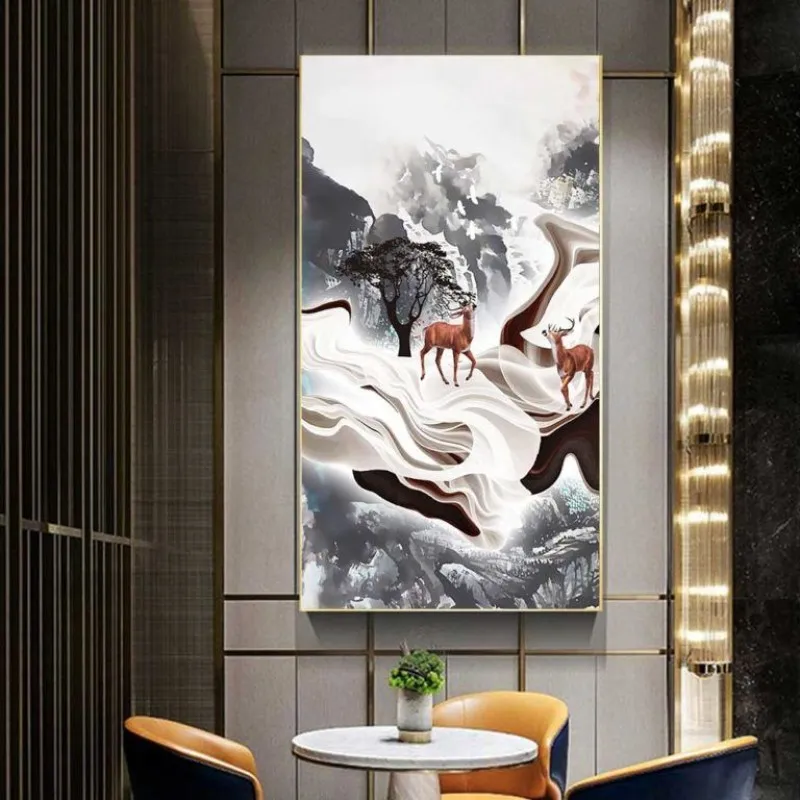 Tranh trừu tượng núi đồi và đàn hươu nai
