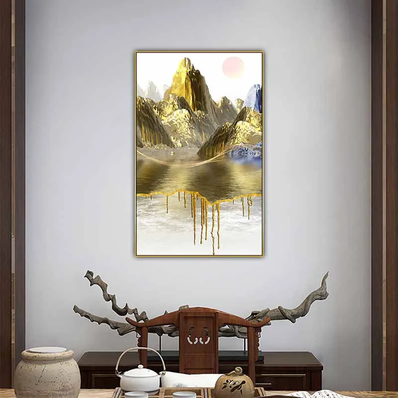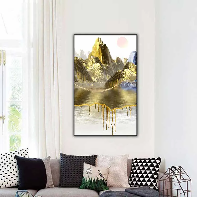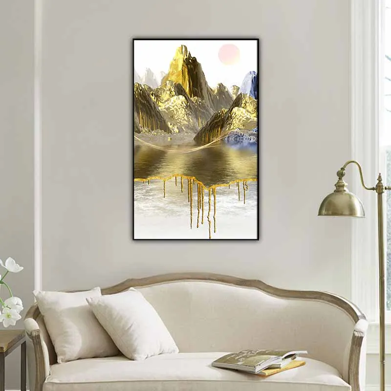 Tranh trang trí trừu tượng phong cảnh ngọn núi vàng ở xa và dòng sông ở trước là một tác phẩm nghệ thuật đẹp mắt, tạo nên hiệu ứng màu sắc độc đáo, tinh tế và đầy cảm hứng, tạo nên sự ấn tượng mạnh mẽ, đầy uyển chuyển.
