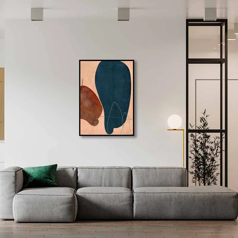 Bức tranh trừu tượng này mang đến một cảm giác ấm áp và hiện đại với sự kết hợp độc đáo giữa mảng màu xanh navy đậm và đỏ đất trầm ấm trên nền be dịu nhẹ. Các hình khối tự do và đường nét ngẫu hứng tạo nên một tác phẩm nghệ thuật cá tính, mang đến điểm nhấn thu hút cho không gian sống của bạn.