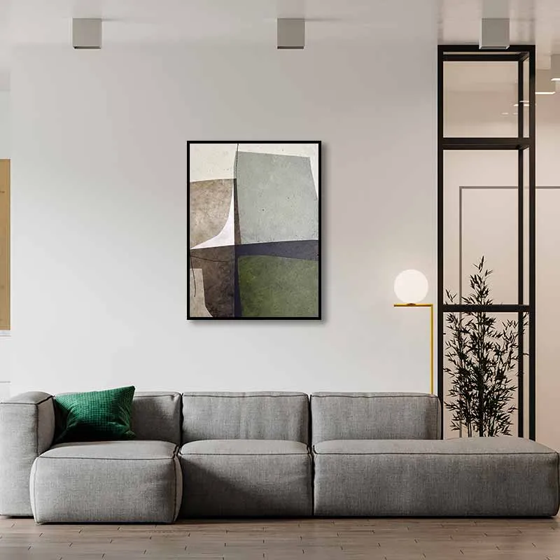 Bức tranh trừu tượng này gây ấn tượng bởi bảng màu trang nhã với các sắc độ khác nhau của màu xám, be và xanh ô liu. Sự sắp xếp các mảng màu một cách hài hòa tạo nên một tổng thể dịu mắt, mang đến cảm giác thư thái và tinh tế cho không gian.