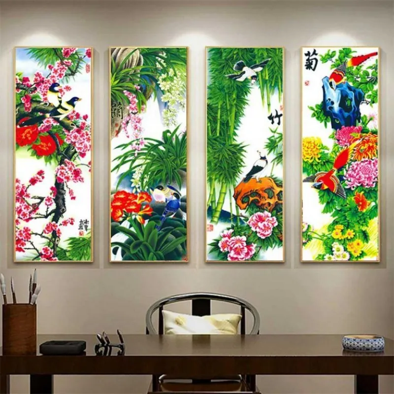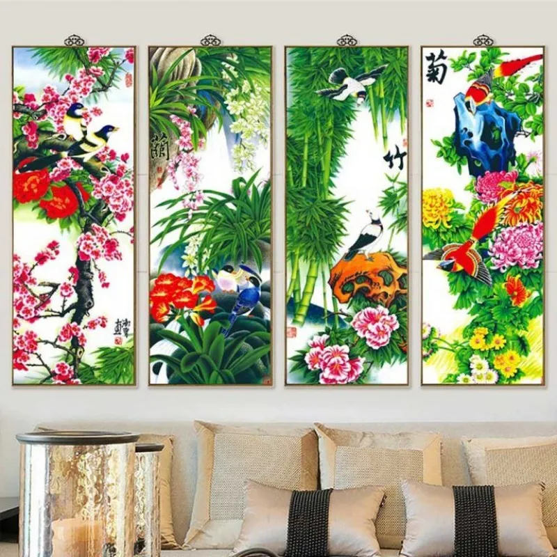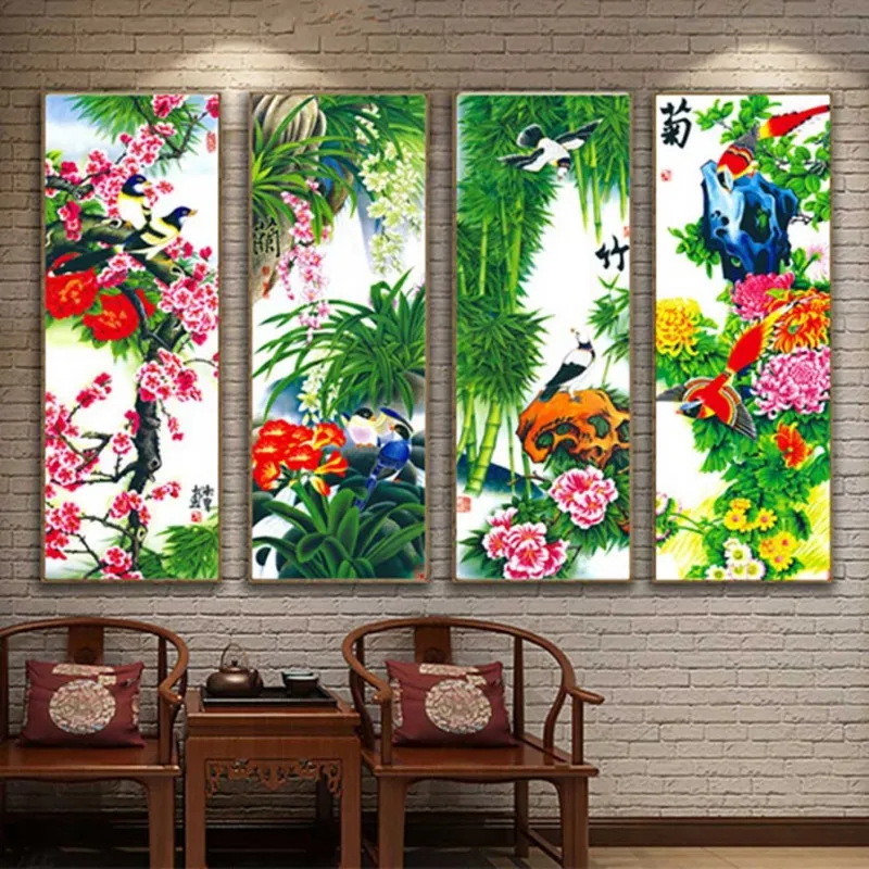Tranh Tứ quý Đào Lan Trúc Cúc và chim