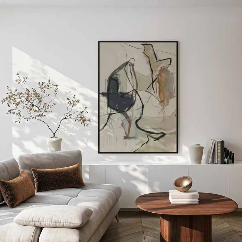 Bức tranh trừu tượng này là sự kết hợp tinh tế giữa các đường nét uốn lượn mạnh mẽ, gợi nhớ nét vẽ than, cùng với những mảng màu sắc trung tính như be, xám, và nâu đất. Bố cục không đối xứng, tự do và gợi cảm giác chuyển động, mang lại vẻ đẹp hiện đại, phóng khoáng và chiều sâu suy tưởng cho không gian, thể hiện sự tinh tế trong nghệ thuật trừu tượng.
