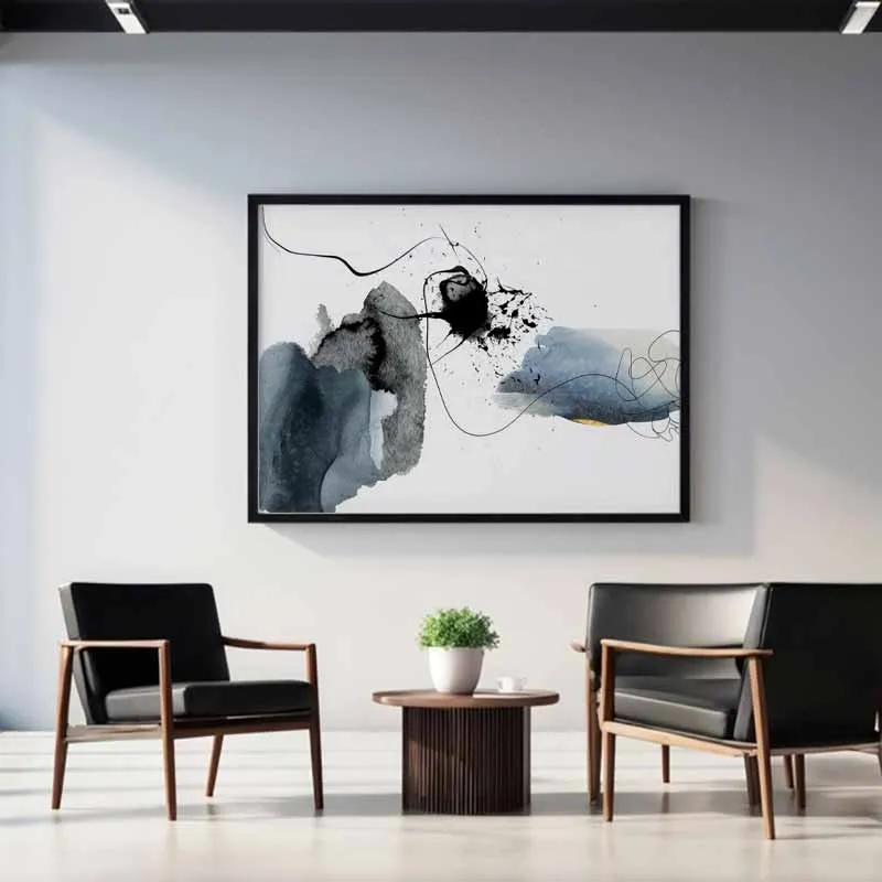 Bức tranh trừu tượng này thể hiện sự tương phản mạnh mẽ giữa nền trắng tinh khôi và những mảng màu xám, đen đậm cùng những nét mực bắn phá đầy ngẫu hứng. Sự kết hợp của những mảng màu lan chảy như màu nước và các đường nét mỏng, sắc nét tạo nên một bố cục động, đầy tính biểu cảm và hiện đại. Tác phẩm gợi cảm giác về sự tự do, phá cách và chiều sâu nghệ thuật.