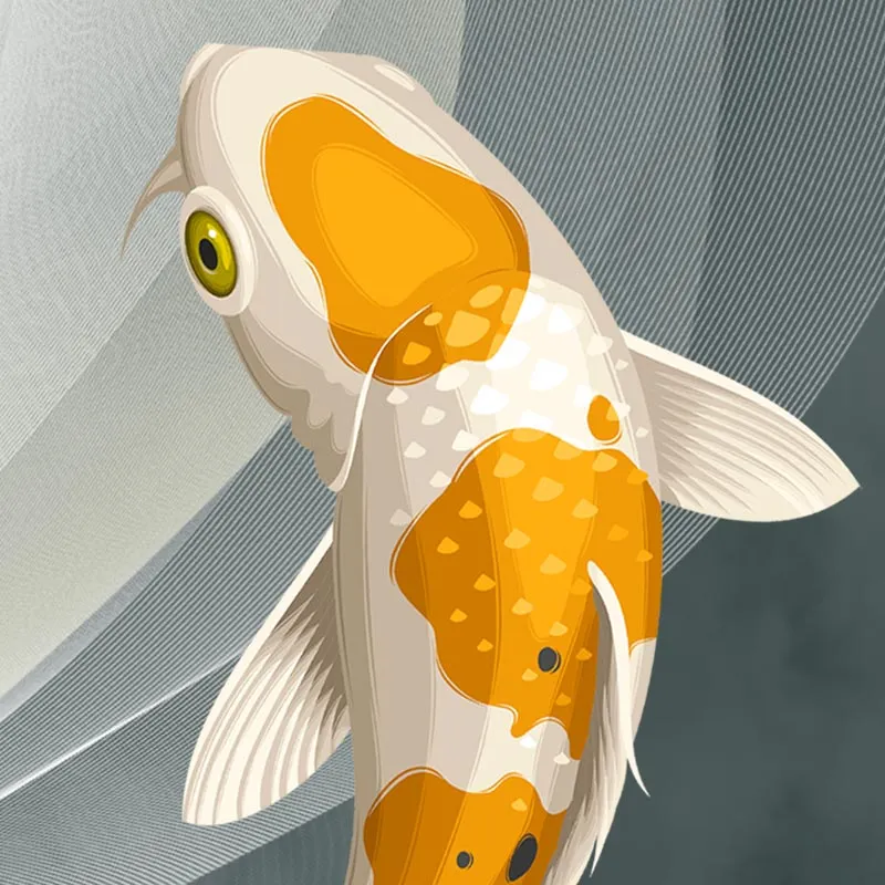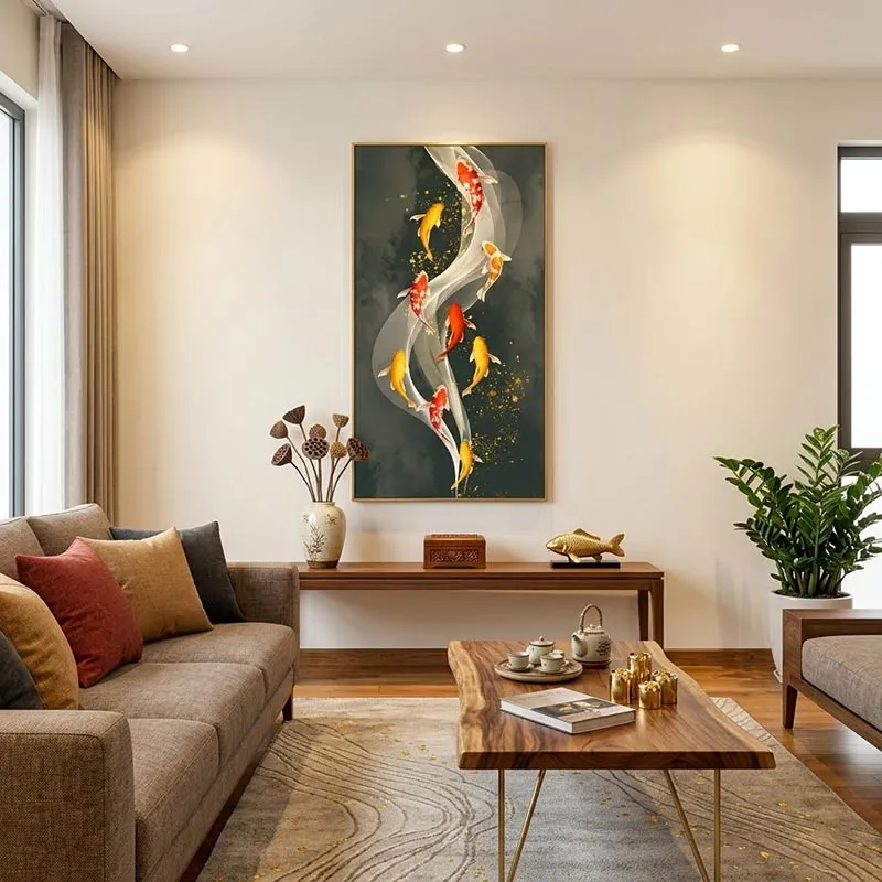 Không gian Hiện đại (Modern): Sắc màu rực rỡ của cá chép sẽ làm điểm nhấn cực kỳ ấn tượng trên những mảng tường sơn màu trung tính (trắng, xám, be) của phong cách hiện đại.